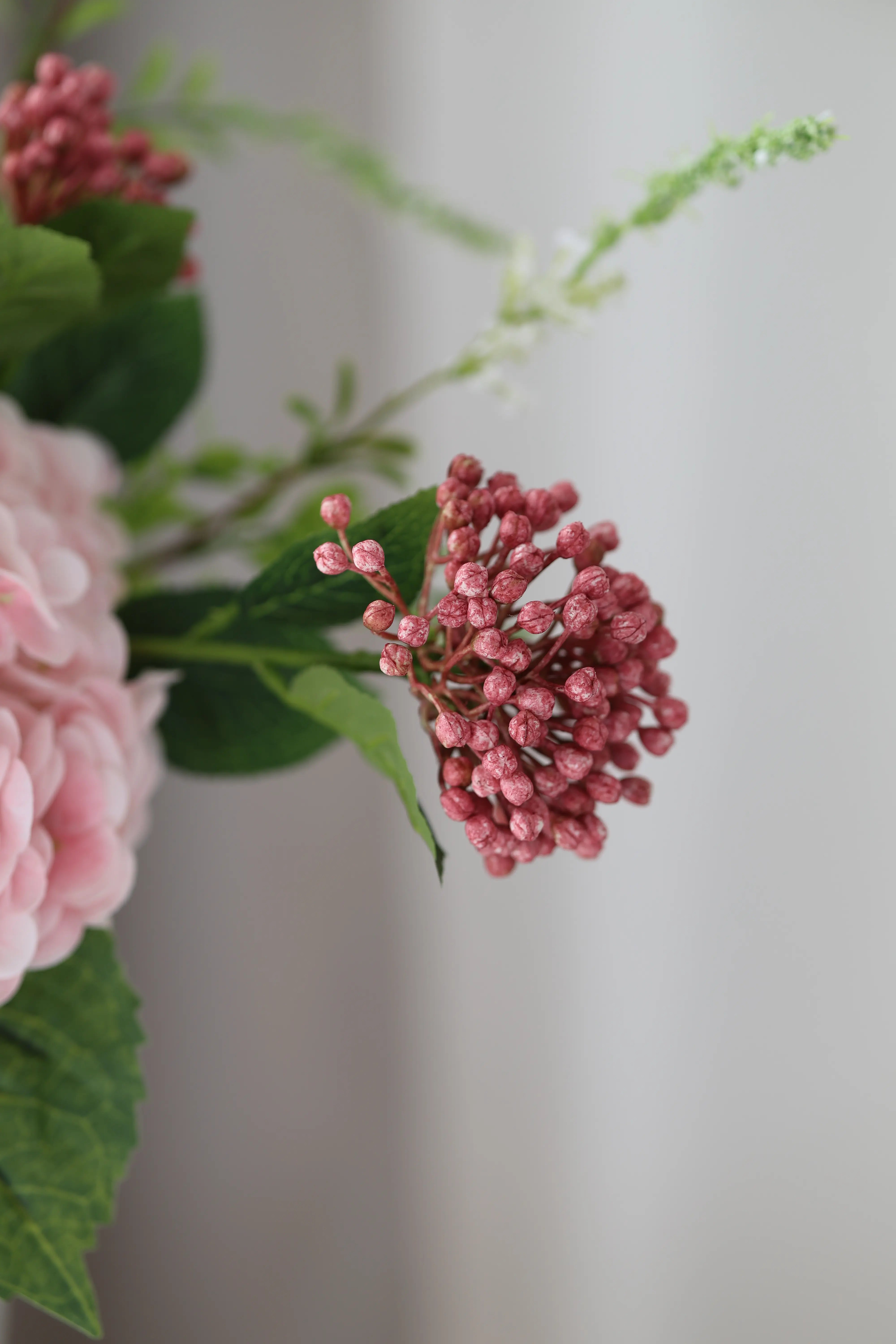 A Baby Pink Whisper csokor a finomság és a nőiesség megtestesítője. A lágy rózsaszín hortenzia romantikus, pasztell árnyalatai gyengéden simulnak a bogyós virágok természetes textúrájához, így a kompozíció egyszerre hat frissnek, mégis időtlenül elegánsnak.