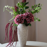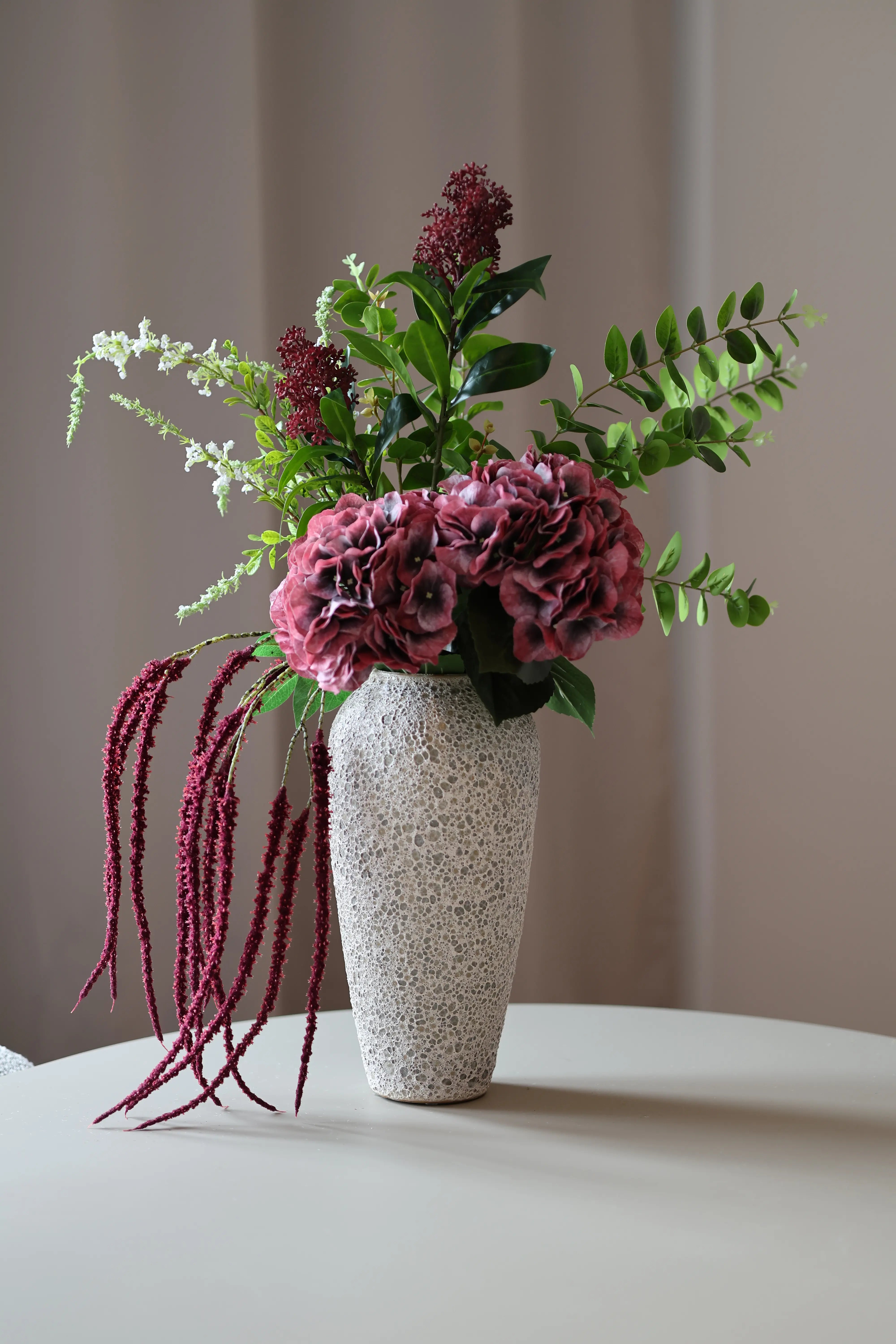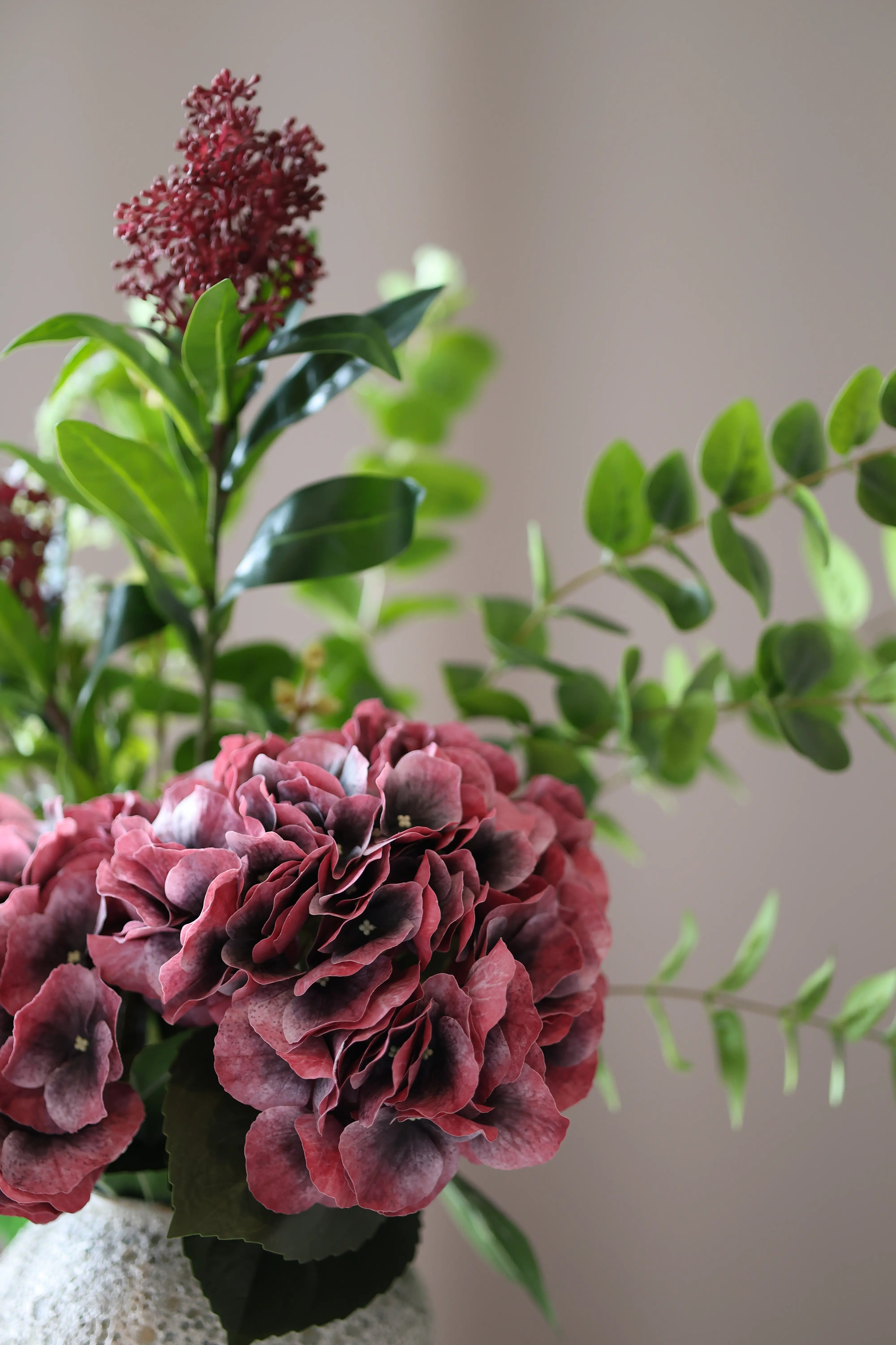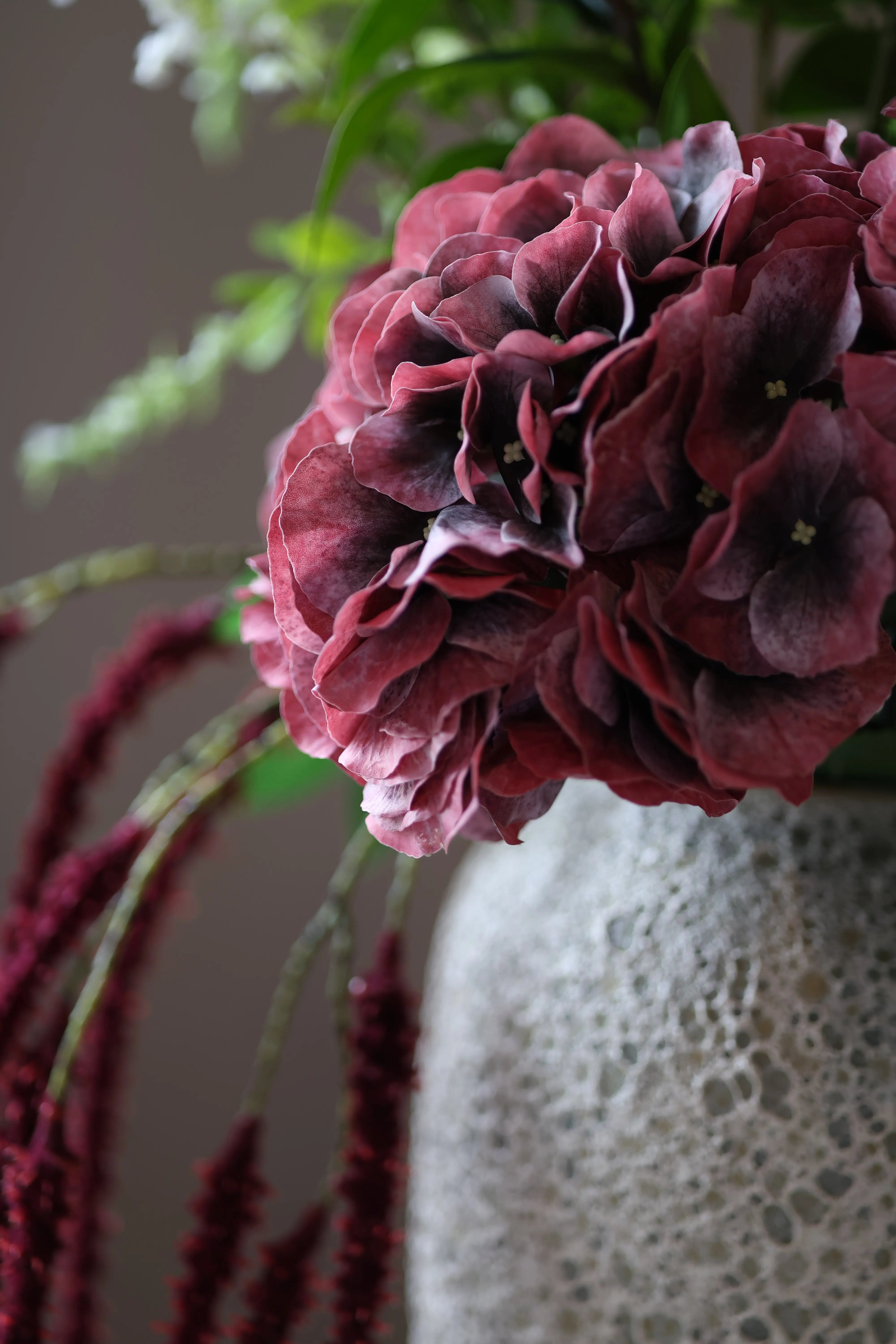 A Burgundy Muse csokor mély, bársonyos tónusaival az őszi elegancia esszenciáját hordozza. A hamvas bordó hortenzia drámai, mégis kifinomult színe uralja a kompozíciót, amelyet a dérbabér halványan ezüstös levelei tesznek igazán különlegessé. A csokor hangulata egyszerre modern és romantikus – mintha egy régi festményről elevenedett volna meg.