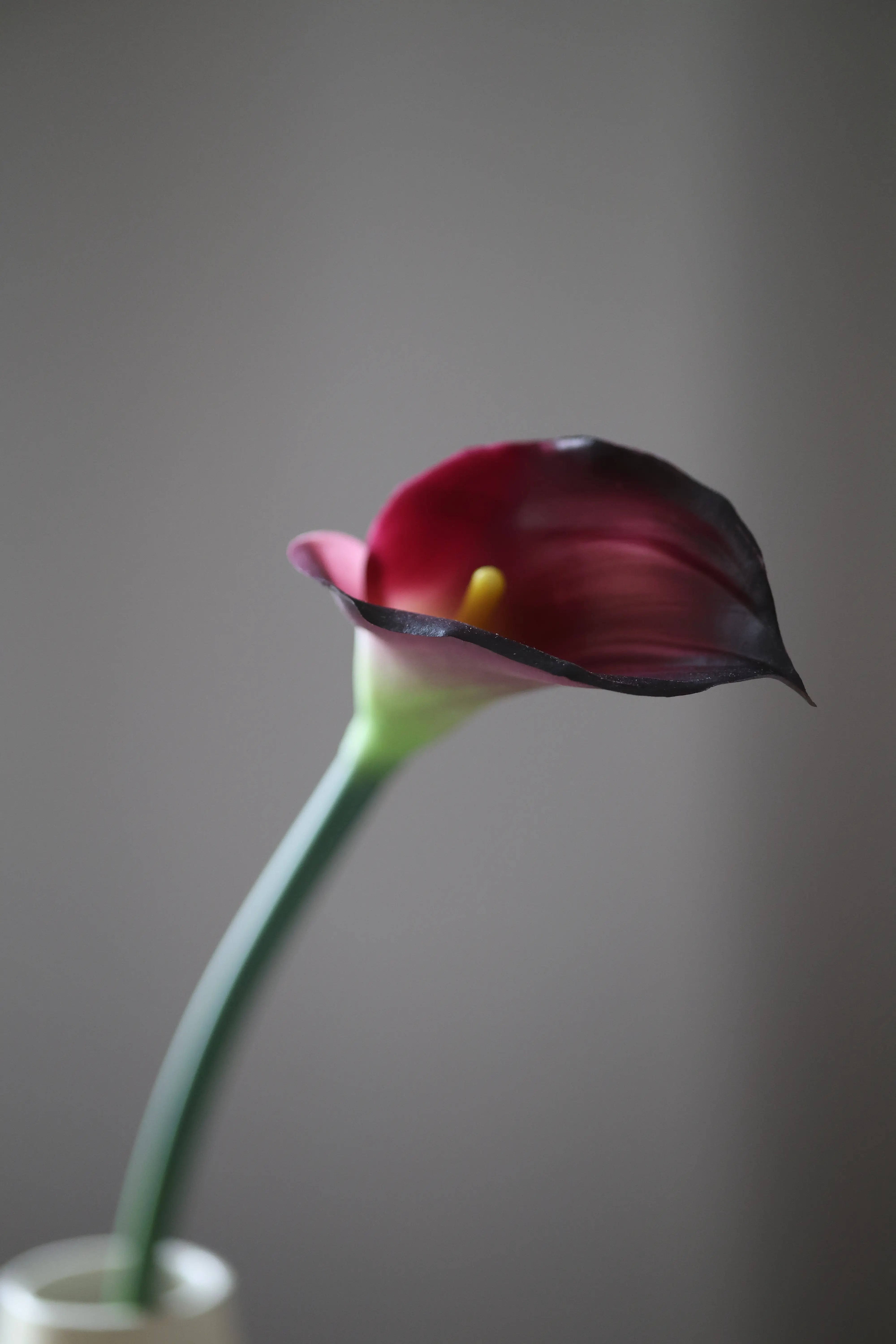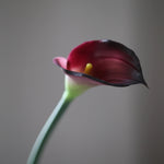 Ez a bordó kála virág rendkívül részletgazdag kialakítású. Egyetlen virágfeje bordó, tölcsér alakú, bársonyos tapintású szirommal rendelkezik, közepén finom sárgás torzsavirággal. A szár hossza kb. 65 cm