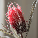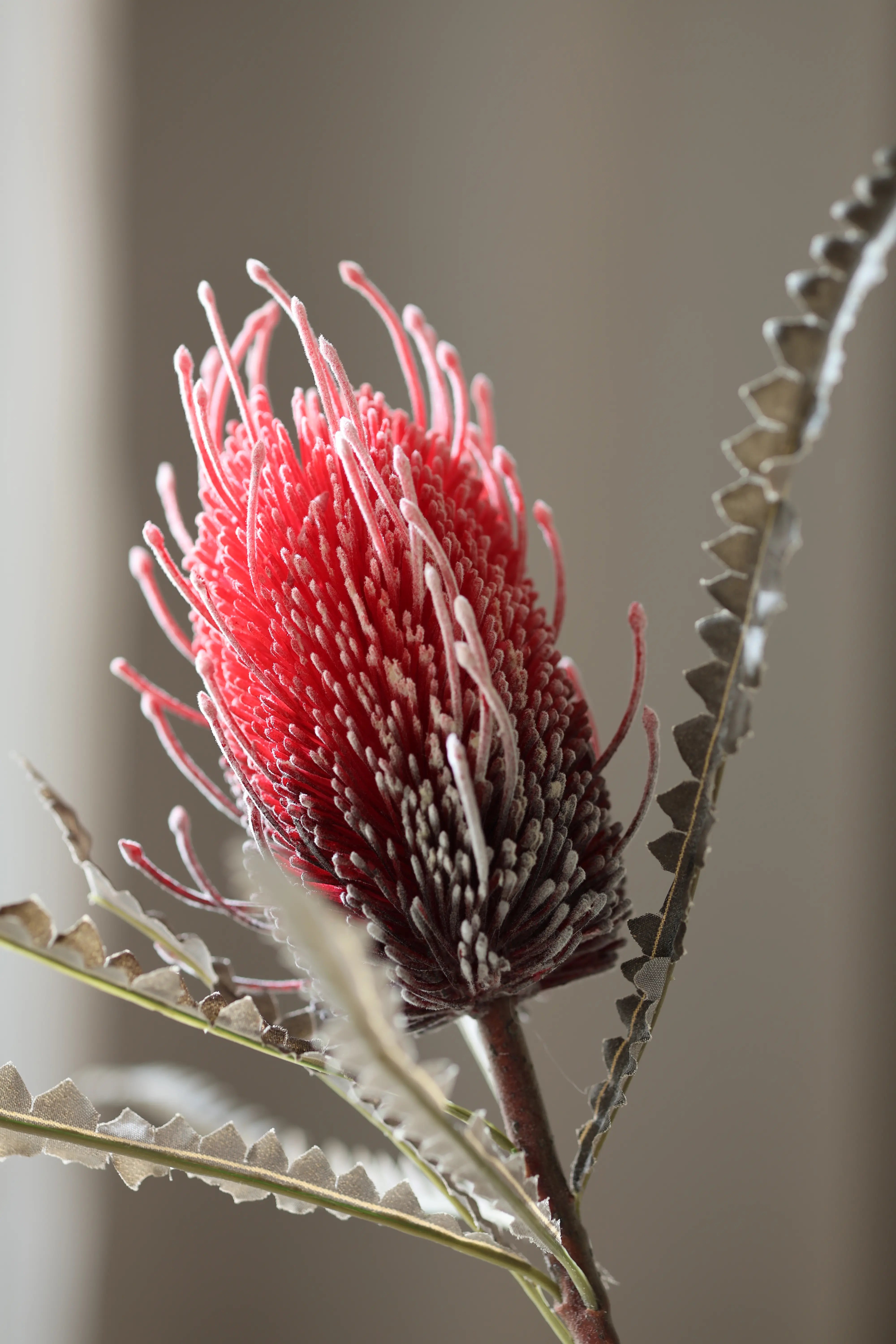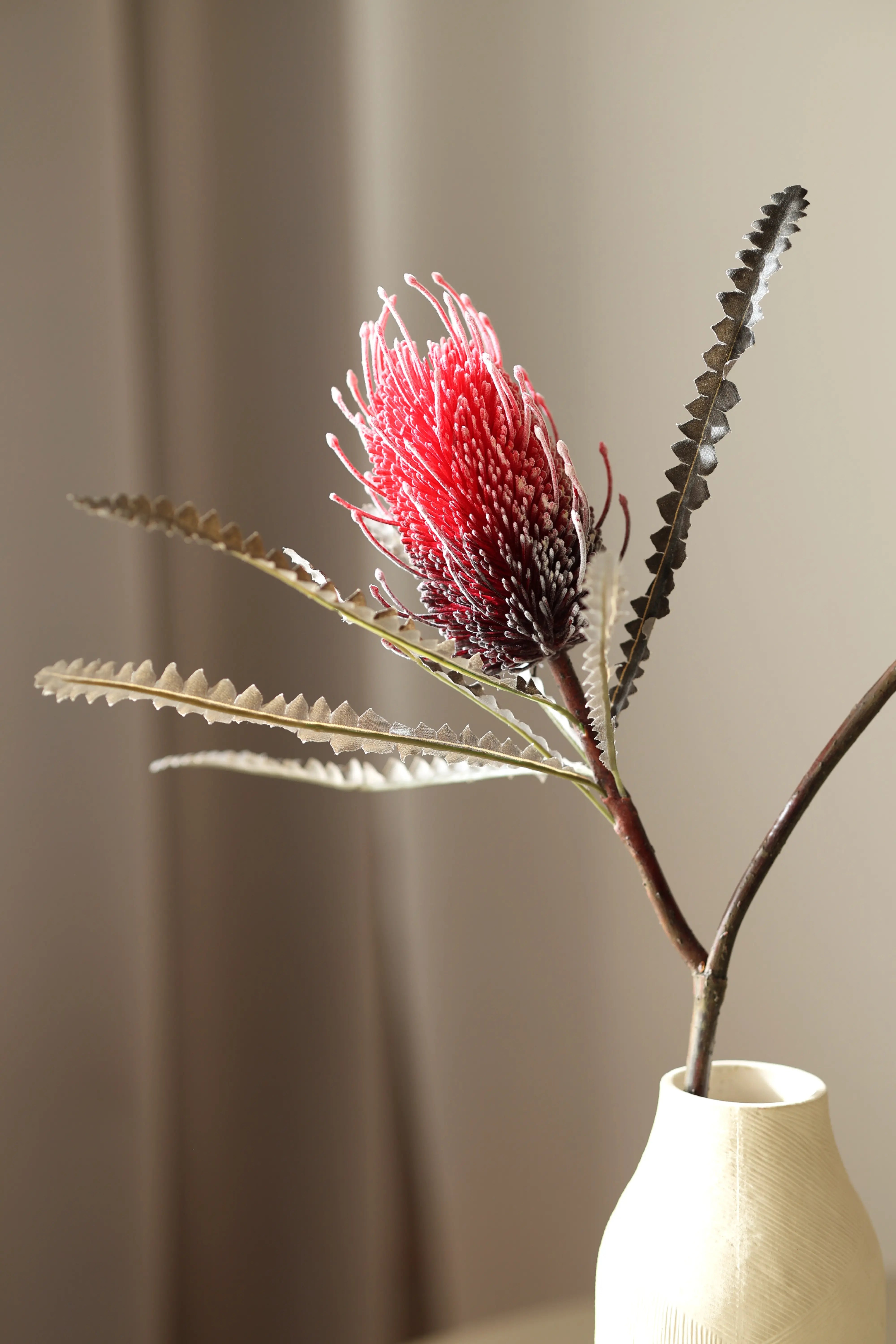 Szoborszerű, karakteres megjelenésű ág, amelyen egy nagy, visszafogott vörös árnyalatú protea virágfej kapott helyet. A virágot kerekded, zöld levelek és egy erős, egyenes szár egészíti ki. A réteges sziromstruktúra és bársonyos felület gazdag textúrát és mélységet kölcsönöz a kompozíciónak. A virágot természetes hatású szár tartja, teljes magassága pedig körülbelül 70 cm – így tökéletes választás önmagában, vagy más ágakkal kombinálva egy látványos, modern dekoráció részeként.