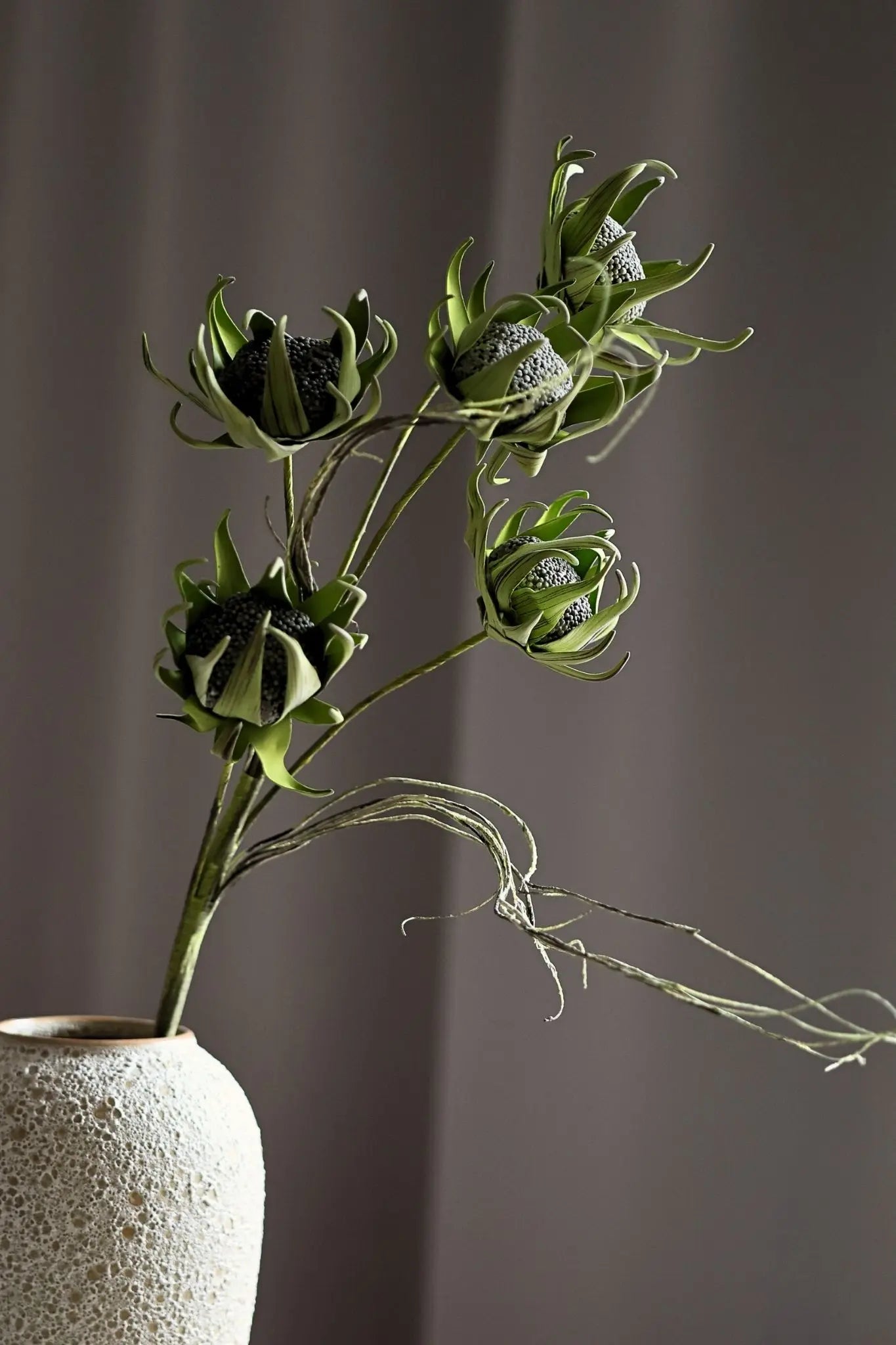 Ez a mesterséges protea ág öt egyedi virágfejet hordoz, amelyek szoborszerű szirmai finoman ívelnek a részletgazdagon kidolgozott középrész köré. Minden virág és levél aprólékosan megmunkált, hogy élethűen idézze a valódi protea megjelenését, miközben tartós és teljesen gondozásmentes marad. Ideális választás azok számára, akik természetes hatású, mégis időtálló dekorációt keresnek.
