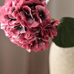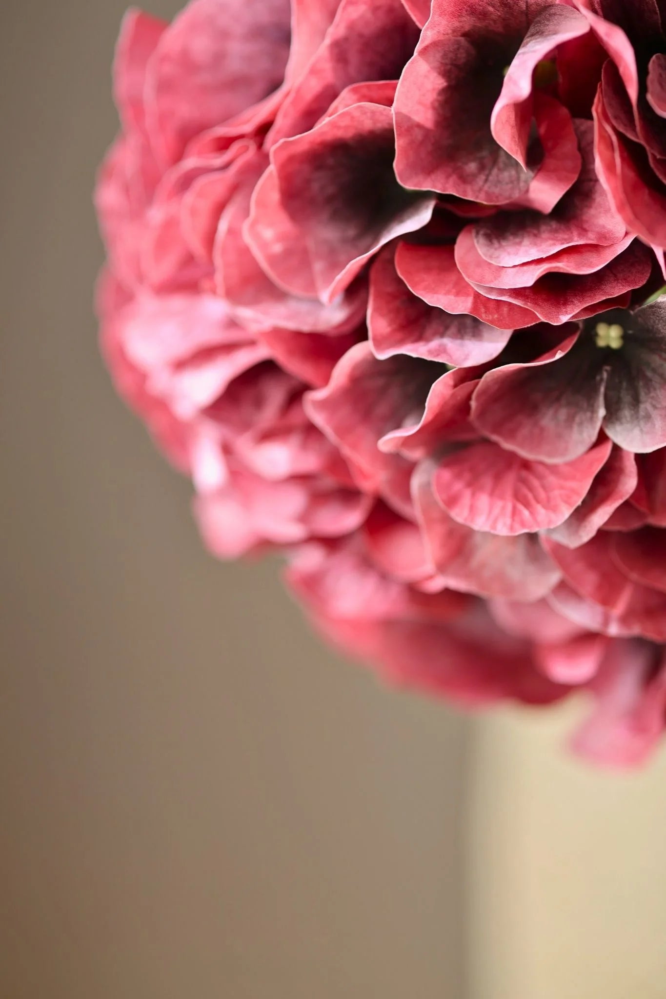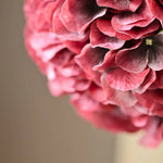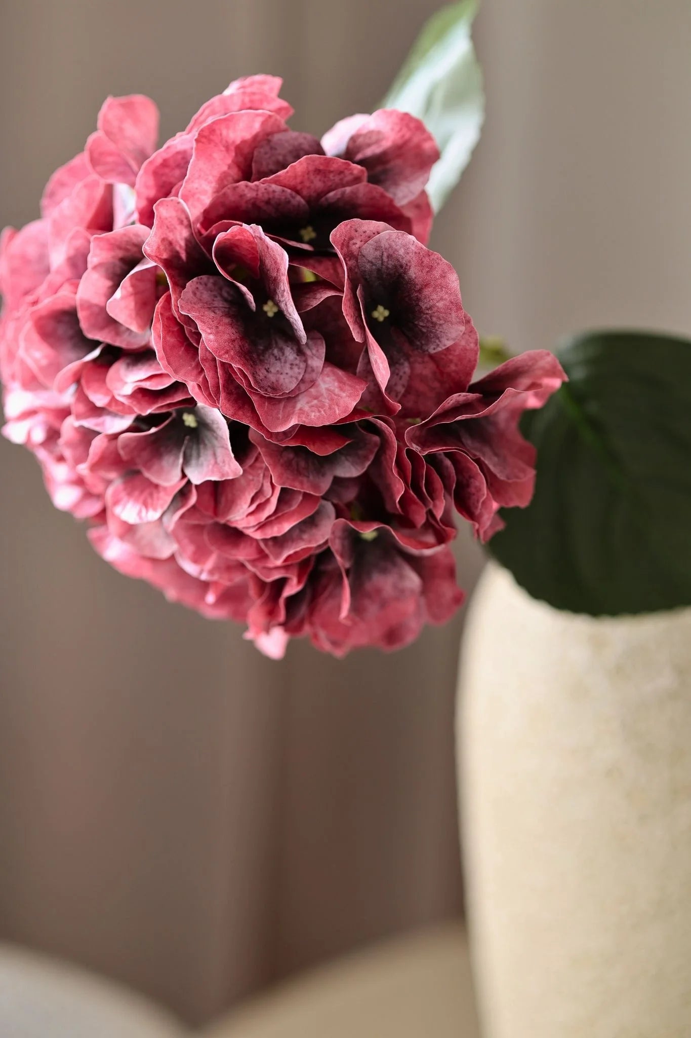 Ez az őszi bordó színű hortenzia mély, gazdag árnyalatú szirmokkal rendelkezik, amelyek finom tónusváltásai természetes textúrát és térhatást kölcsönöznek a virágnak. A réteges szirmok dús, telt virágfejet alkotnak, amelyet széles, erezett zöld levelek egészítenek ki. A szár hossza kb. 65 cm.