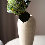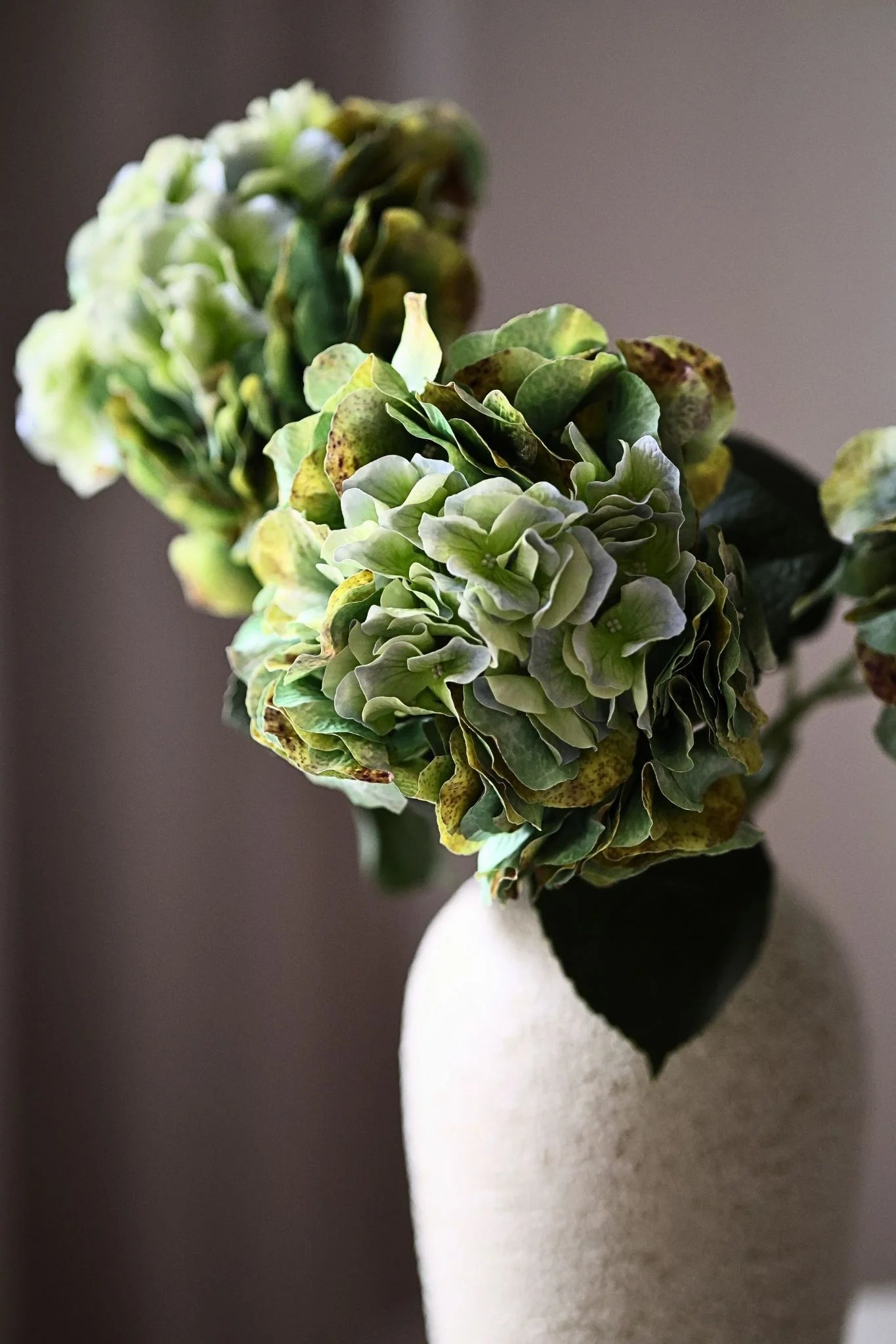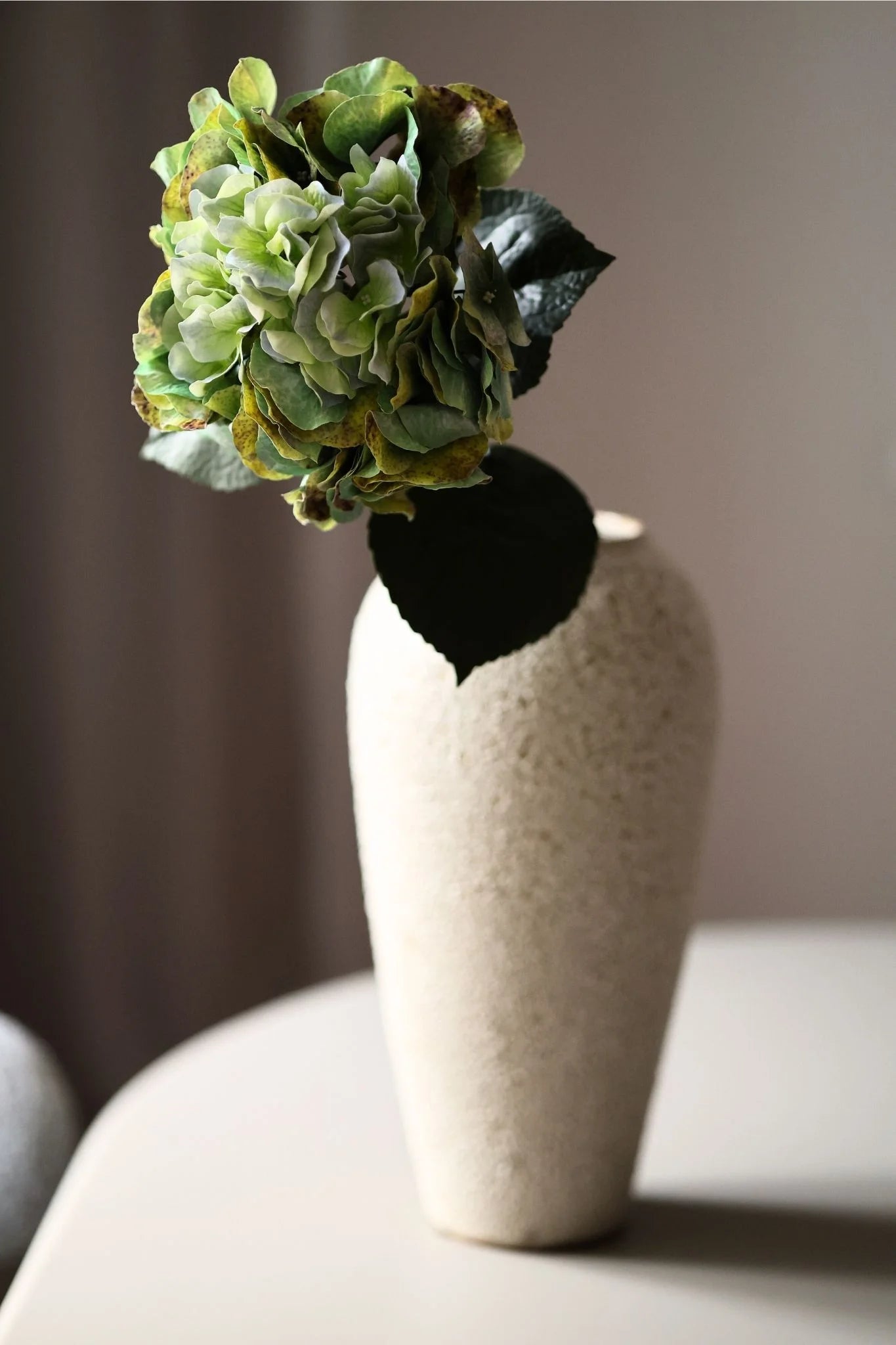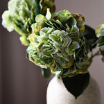 Ez az őszi zöld színű hortenzia mély, gazdag árnyalatú szirmokkal rendelkezik, amelyek finom tónusváltásai természetes textúrát és térhatást kölcsönöznek a virágnak. A réteges szirmok dús, telt virágfejet alkotnak, amelyet széles, erezett zöld levelek egészítenek ki. A szár hossza kb. 65 cm.