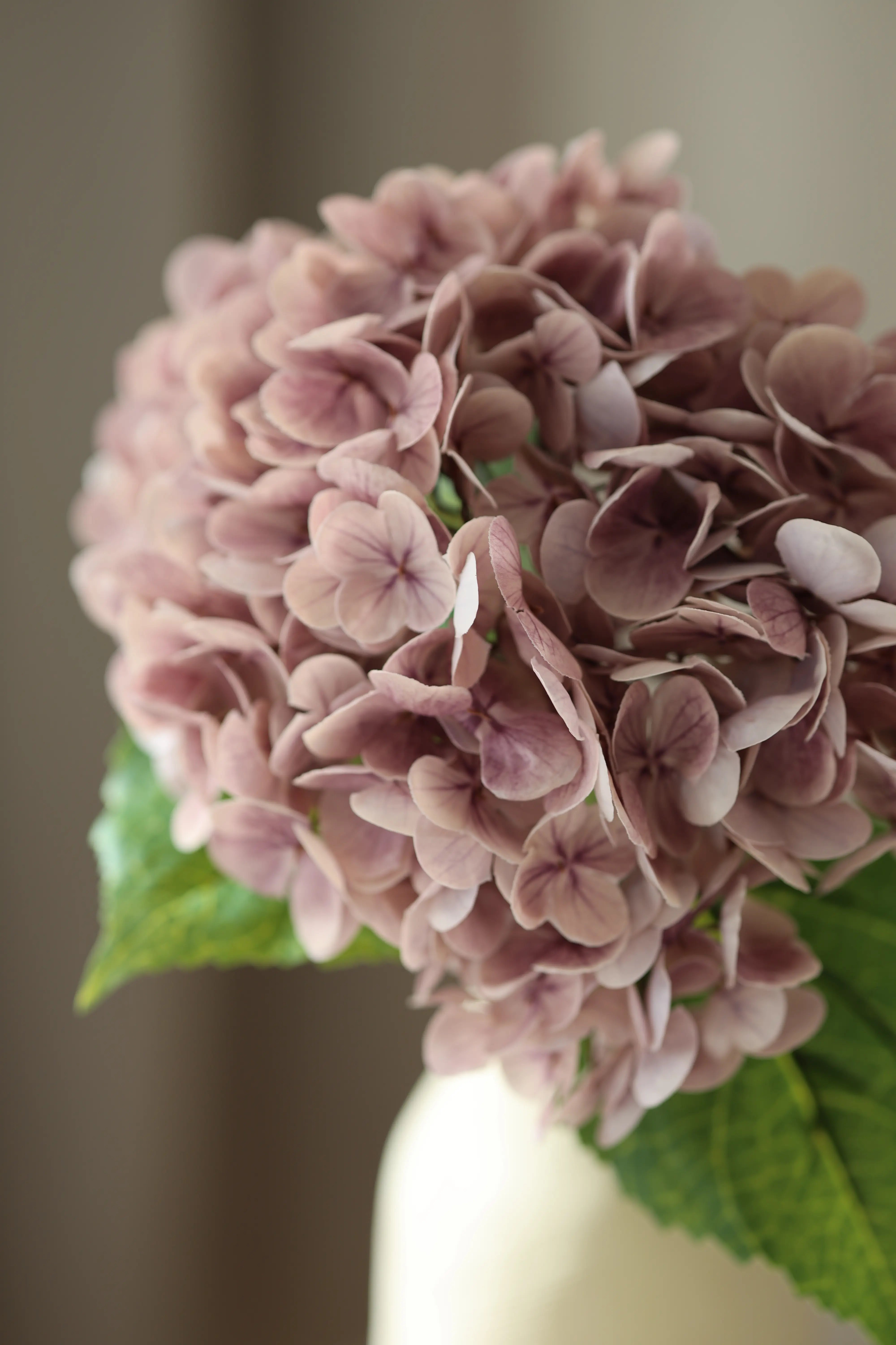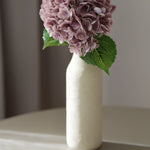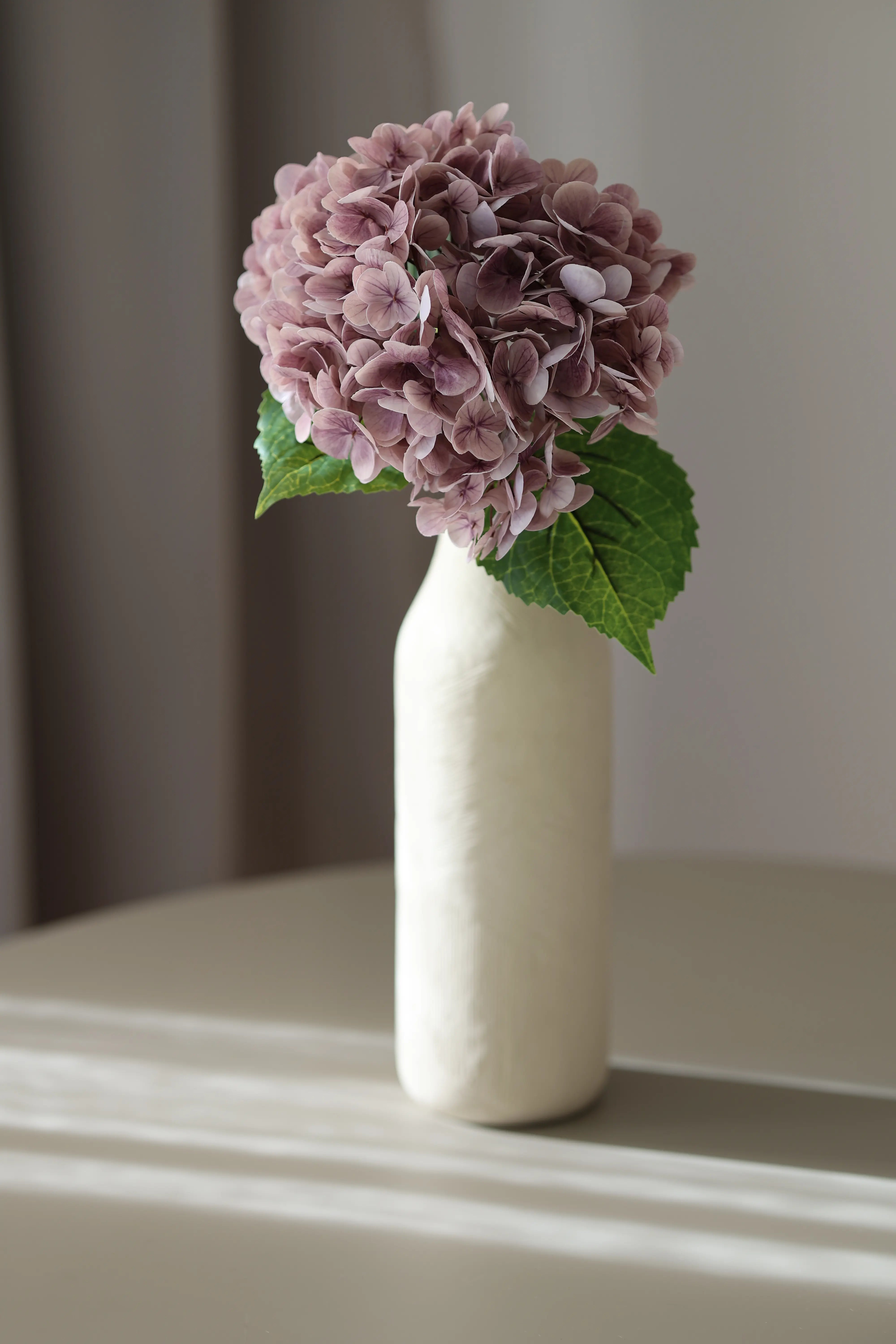 Két zöld levél kíséri, amik nem tolakodnak, csak szépen ellensúlyozzák a virág puhaságát. A szár 49 cm hosszú, nem túl merev, de elég stabil ahhoz, hogy bármilyen vázában szépen megálljon – például egy egyszerű, természetes kerámiában, mint a képen is.