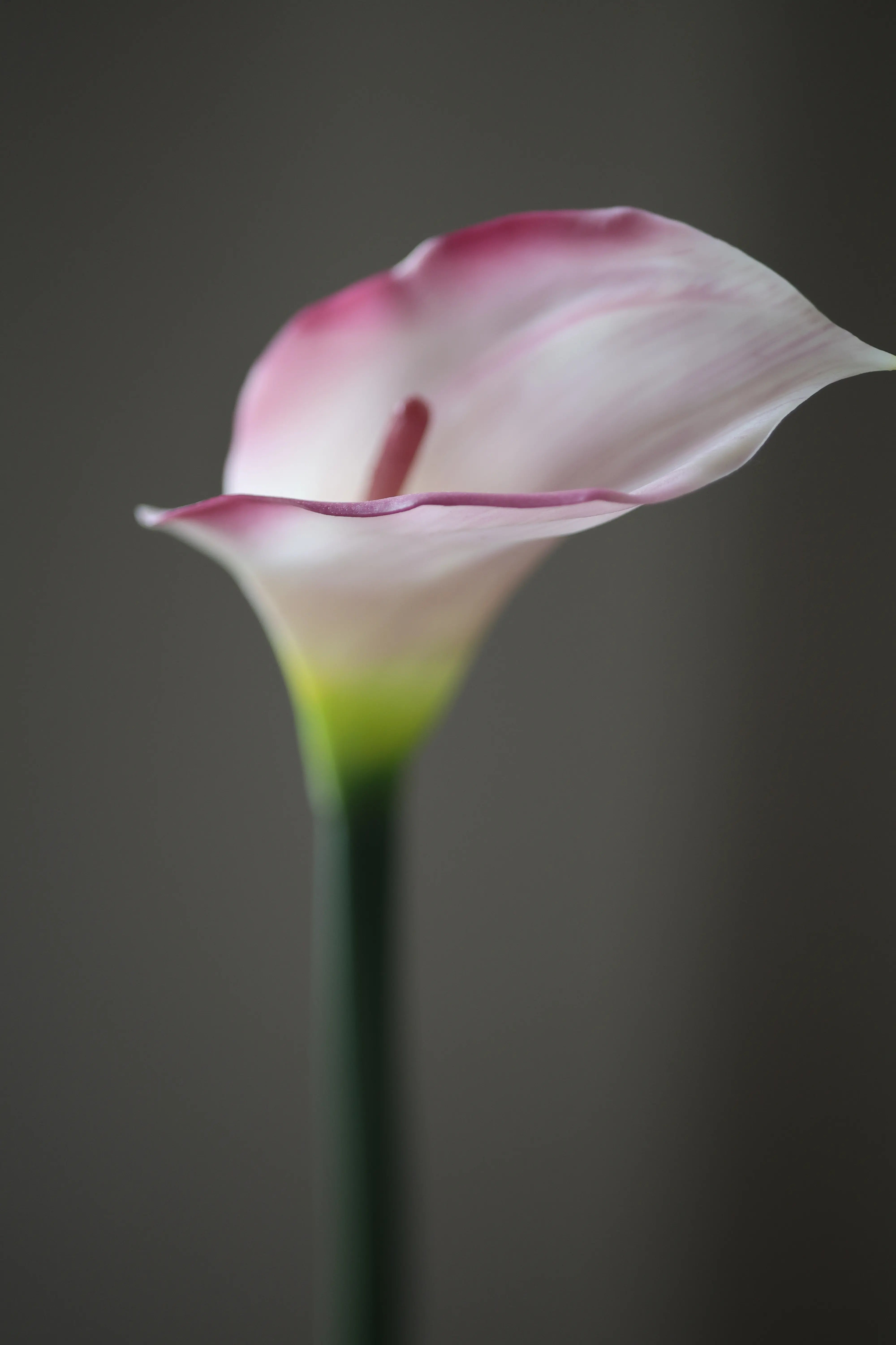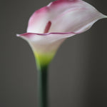Ez a rózsaszín kála virág rendkívül részletgazdag kialakítású. Egyetlen virágfeje bordó, tölcsér alakú, bársonyos tapintású szirommal rendelkezik, közepén finom sárgás torzsavirággal. A szár hossza kb. 65 cm