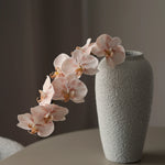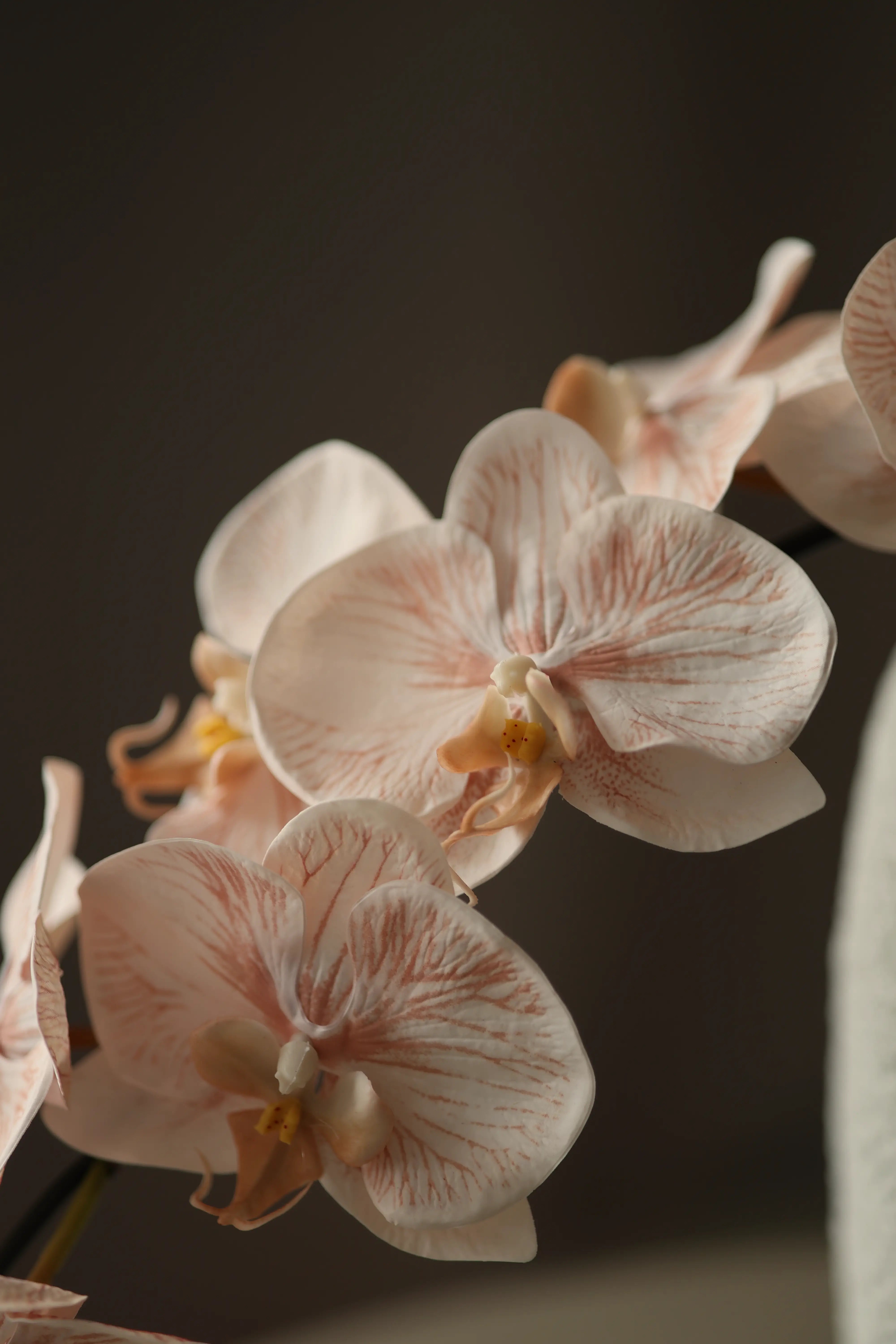 This white boat orchid is like a soft inner smile – delicate, clean, yet elusively elegant. The six creamy white flowers have silky petals that curve slightly, almost floating along the stem, with a small yellow and burgundy detail in the middle that makes the whole composition seem alive. At the top of the stem rest two closed buds – restrained, but promising, as if there is something more in store.