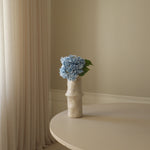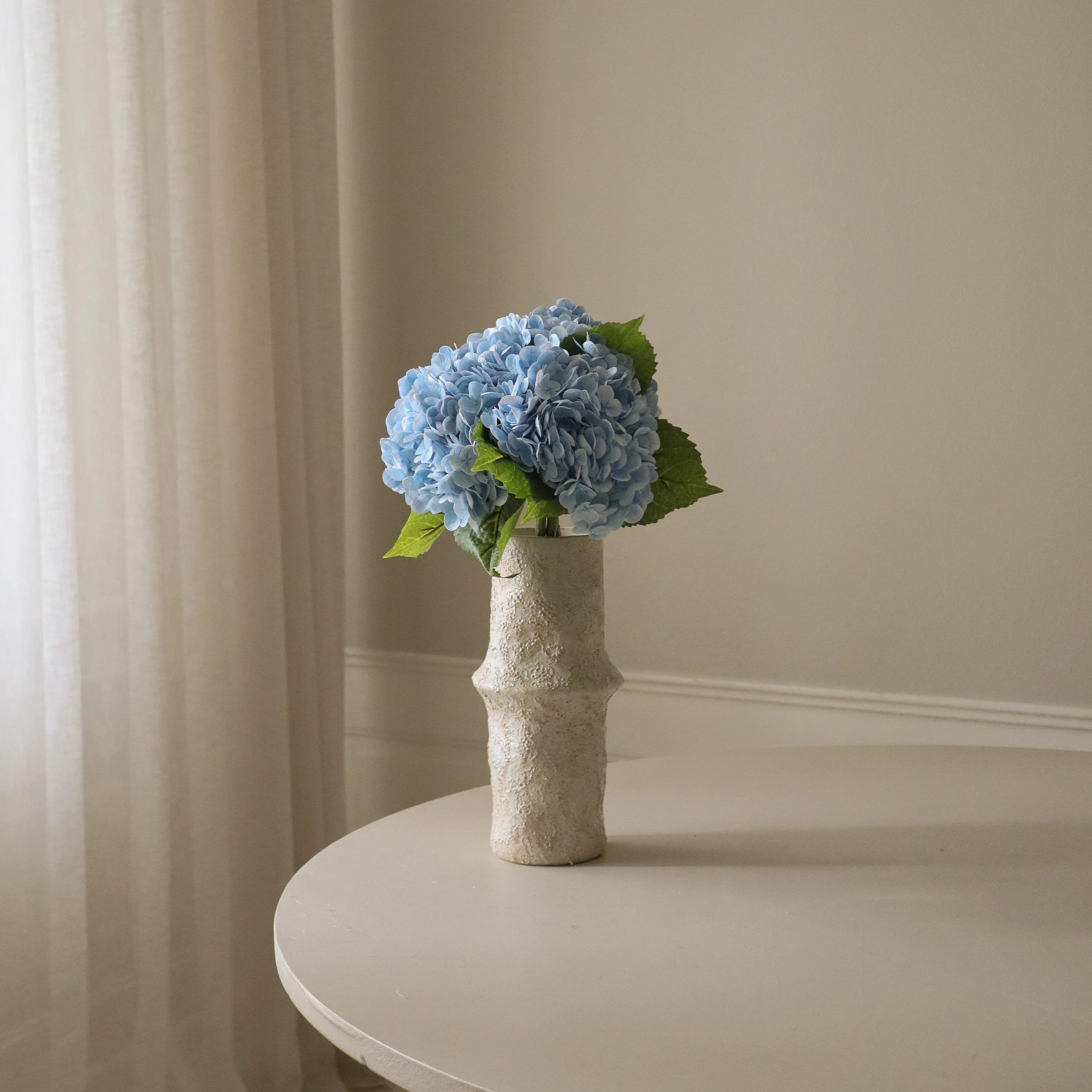 Két zöld levél kíséri, amik nem tolakodnak, csak szépen ellensúlyozzák a virág puhaságát. A szár 49 cm hosszú, nem túl merev, de elég stabil ahhoz, hogy bármilyen vázában szépen megálljon – például egy egyszerű, természetes kerámiában, mint a képen is.