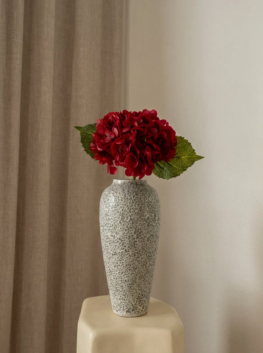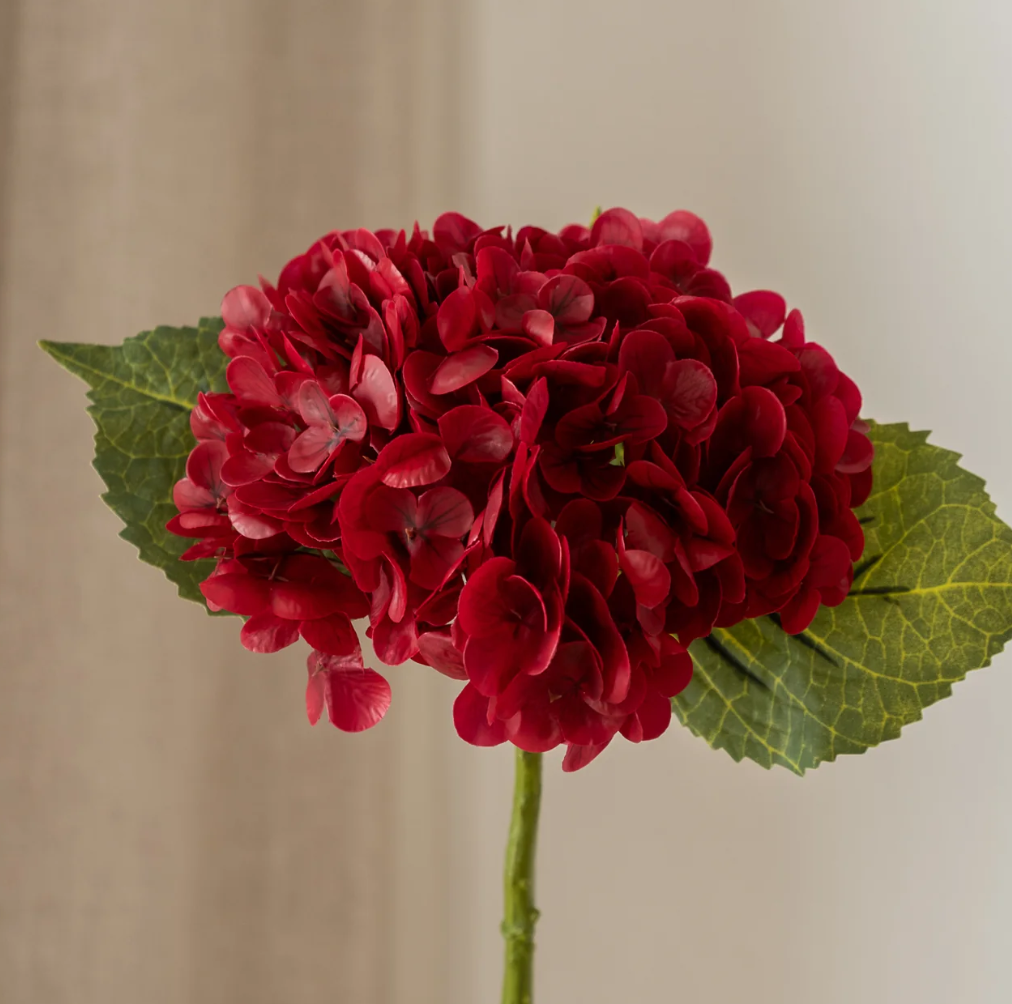 Ez az őszi bordó színű hortenzia mély, gazdag árnyalatú szirmokkal rendelkezik, amelyek finom tónusváltásai természetes textúrát és térhatást kölcsönöznek a virágnak. A réteges szirmok dús, telt virágfejet alkotnak, amelyet széles, erezett zöld levelek egészítenek ki. A szár hossza kb. 65 cm.