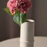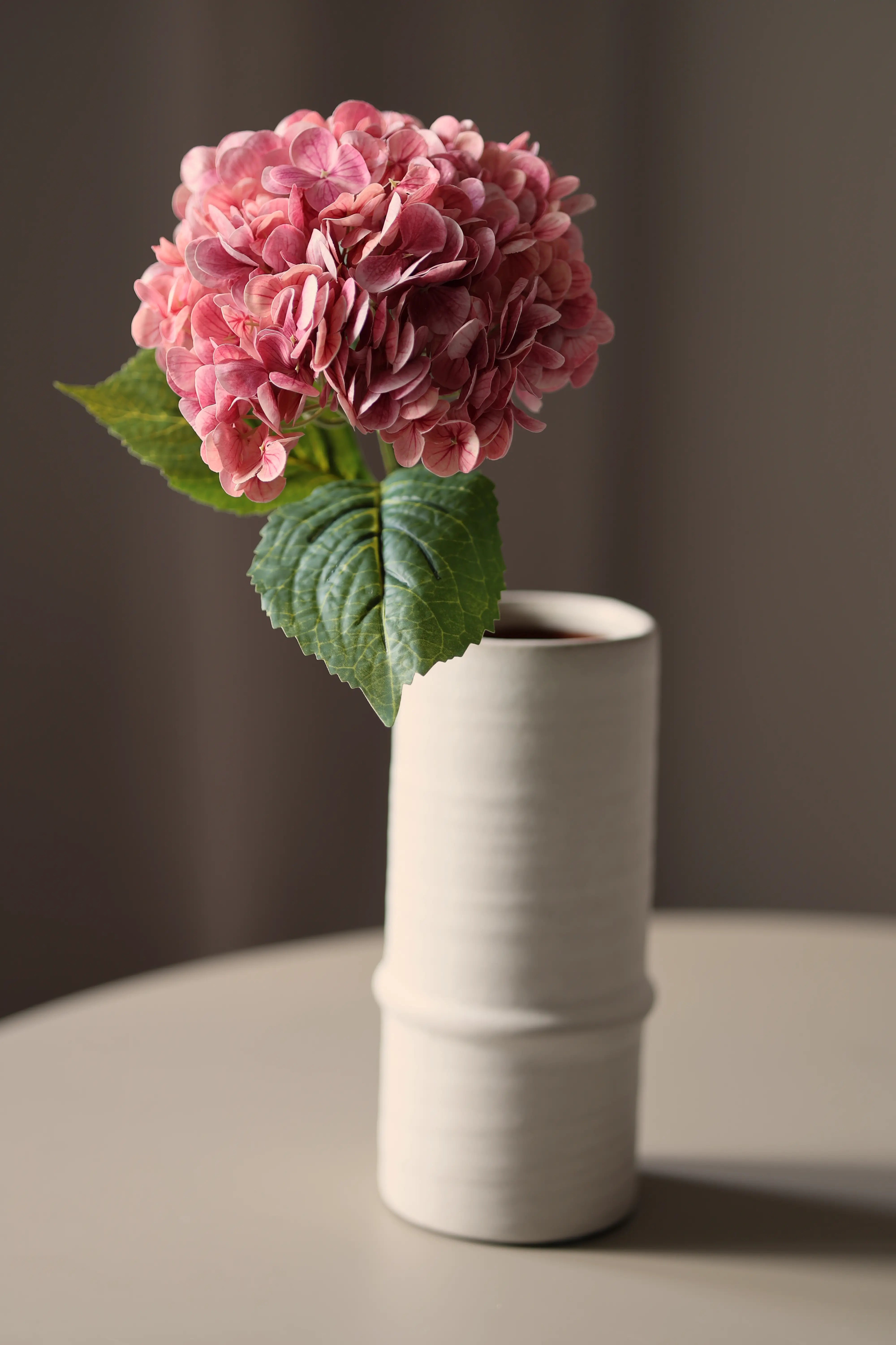 Két zöld levél kíséri, amik nem tolakodnak, csak szépen ellensúlyozzák a virág puhaságát. A szár 49 cm hosszú, nem túl merev, de elég stabil ahhoz, hogy bármilyen vázában szépen megálljon – például egy egyszerű, természetes kerámiában, mint a képen is.