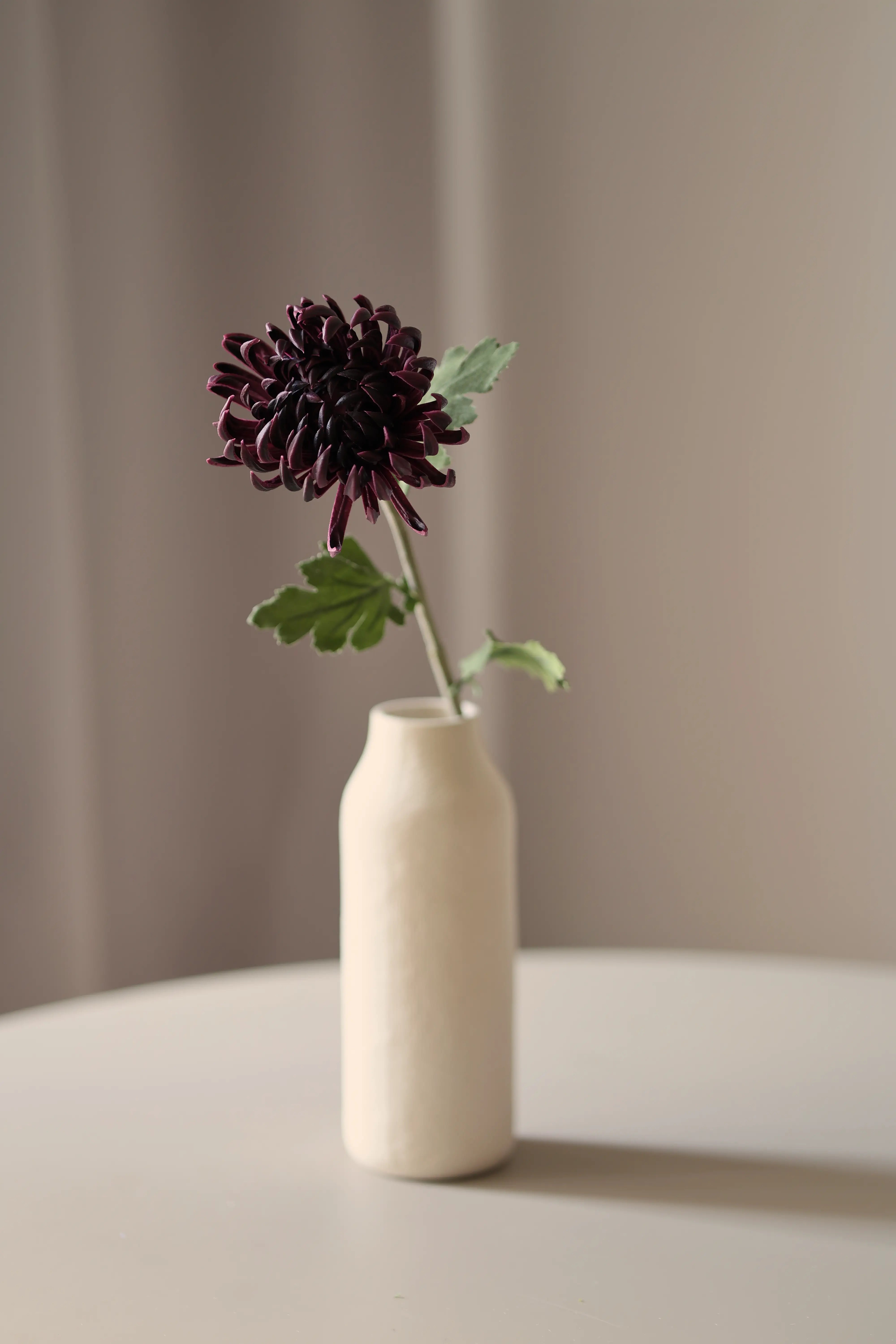 A virágfej dús és karakteres, de nem hivalkodó. A 72 cm hosszú, enyhén texturált zöld száron több fűrészes szélű levél fut végig, mintha csak most vágtad volna le egy bokros, vadon nőtt növényről. Természetes vonalvezetése miatt bármilyen vázában szépen mutat – akár egy darabban is, ha csak egy kis organikus részletre vágysz.
